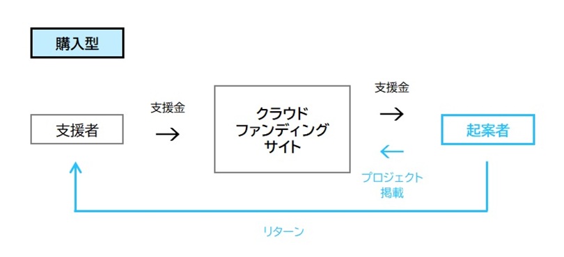 「購入型」とは、起案されたプロジェクトに対して支援者がお金を支援し、支援者はリターンとして、モノやサービスを受け取ることができます。「購入型」では、支援者は起案者がリターンとして設定した商品やグッズ、サービス等を購入するような感覚で支援できますが、金銭的な見返りがリターンとなることはありません。