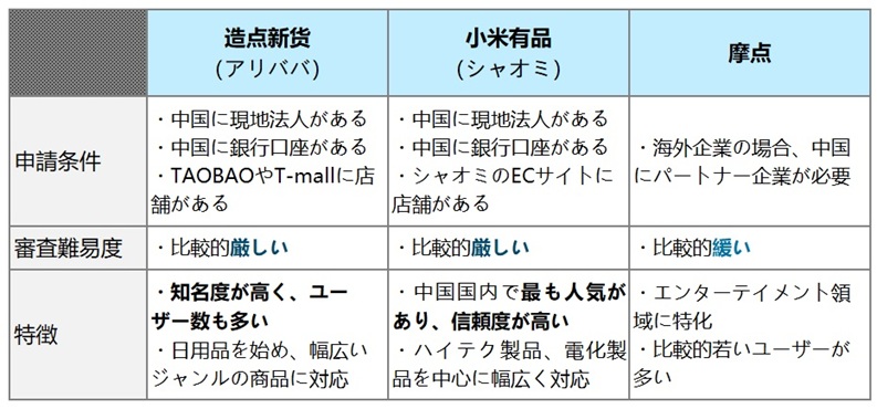 中国の主なクラウドファンディング運営サービスを利用する場合の申請条件や特徴をまとめました。