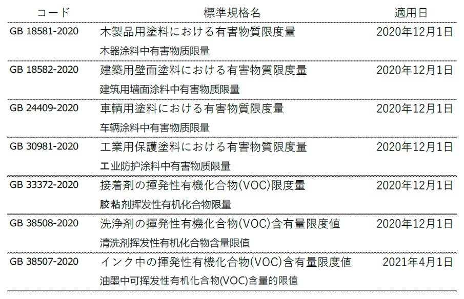 ・GB 33372-2020:接着剤の揮発性有機化合物(VOC)限度量 https://members.wto.org/crnattachments/2019/TBT/CHN/19_5663_00_x.pdf